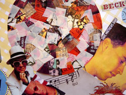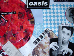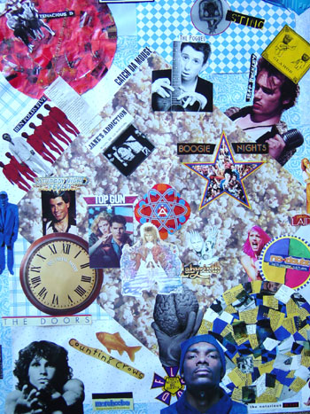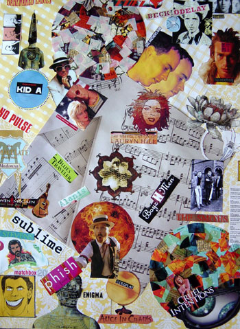I started these pieces January 2nd, 2005 and finished last night (Jan. 4th). My inspiration started when I decided to sort through our monstrous CD collection. We ended up with a boxful of misfit cases, which used to contain CD's that were lost or stolen. I used artwork and logos from my old CD cases and incorporated them into these 2 murals. They are now framed and hanging on the wall side-by-side. |