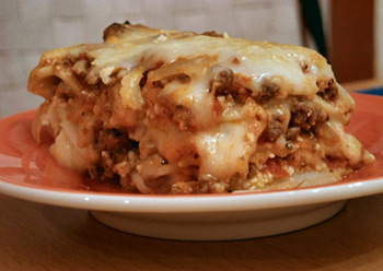 In a 2 quart pot, melt 5 tablespoons of butter over medium heat. When butter has completely melted, add the flour and whisk until smooth, about 2 minutes. Gradually add the milk, whisking constantly to prevent any lumps from forming. Continue to simmer and whisk over medium heat until the sauce is thick, smooth and creamy, about 10 minutes. The sauce should be thick enough to coat the back of wooden spoon. Remove from heat and add the nutmeg and tomato sauce. Sitr until well combined and check for seasoning. Set aside. In a saute pan, heat the pan and add the ground turkey or beef and season with salt and pepper. Brown meat, breaking any large lumps, until it is no longer pink. Remove from head and drain any excess fat. Set aside.