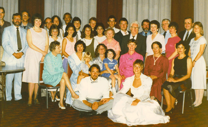 third row: uncle jimmy, aunt stephanie, susan and alison krohn, judy, caryn,aunt emily, uncle gerard, mom, billy rooney's wife, lorraine, jennifer mcgunnigle.