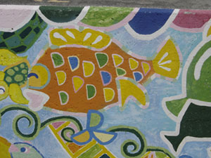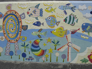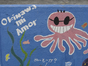 In Okinawa, in many places around the water you will find a sea wall. You find sea walls all around the island! A bunch of excellent graffitti is all on it! We took a bunch of pictures of the art work. It is beautiful! If you ever come to Okinawa, go by the sea and check out the beautiful pictures. Take a look at some of these: