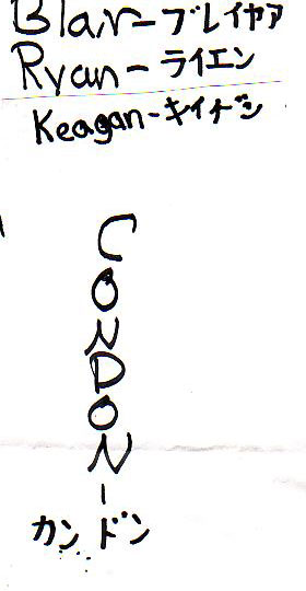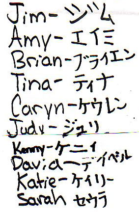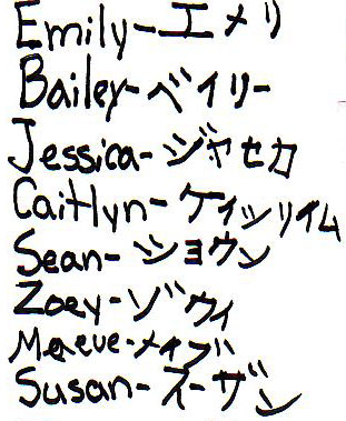 I found out all of your names in Japanese! Here they are. I have a Japanese friend named Saaya who helped me. I also take two classes, Japanese language and culture. I even know how to use the Japanese calculator! Anyways, here are your names: